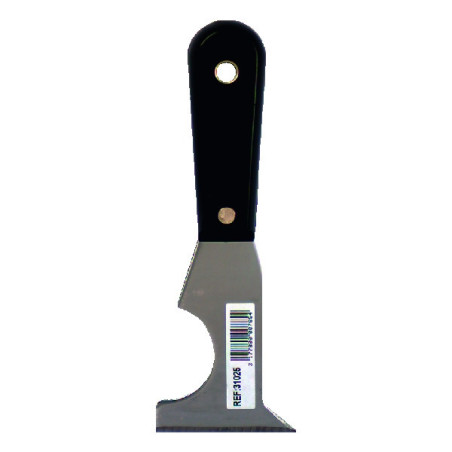 Manche bi-matière ergonomique. Lame inox affûtée. Pour gratter. décaper. élargir les fissures. reboucher. nettoyer les rouleaux. extraire les manchons ABS. arracher les clous.