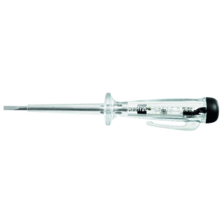 Garde de sécurité largeur : 5 mm. Témoin lumineux. Tension 110-250 volts. Manche transparent. Lame en acier vanadium chromé. Extrémité lame en phosphate noir durci. Avec agrafe. Détecteur basse tension