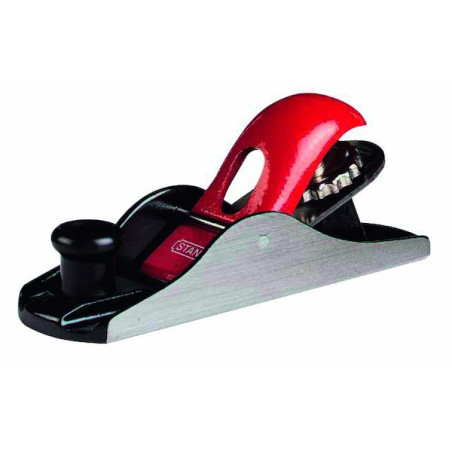 Petit rabot à semelle en fonte usinée. Finition laquée noire. Position du fer à 21°. Réglage manuel de profondeur du fer et de gauchissement. Bloc d’arrêt en aluminium laqué. Joues rectifiées.