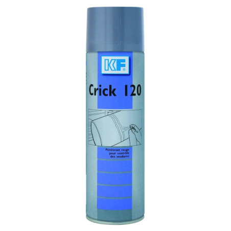 Le pénétrant Crick 120 permet de détecter des criques et des fissures par ressuage.Contrôle non destructif.Liquide rouge. pénétrant et s’infiltrant jusqu’au fond des micro-fissures de la zone à contrôler.Visible à la lumière blanche naturelle.Lavable à l’eau.Détection des fissures jusqu’à 20 microm.L'aérosol est muni d'une valve multipositions pour une utilisation facilité.Le contrôle se fait en trois étapes. Crick 110 (nettoyant). Crick 120 (pénétrant) et le Crick 130 (révélateur).