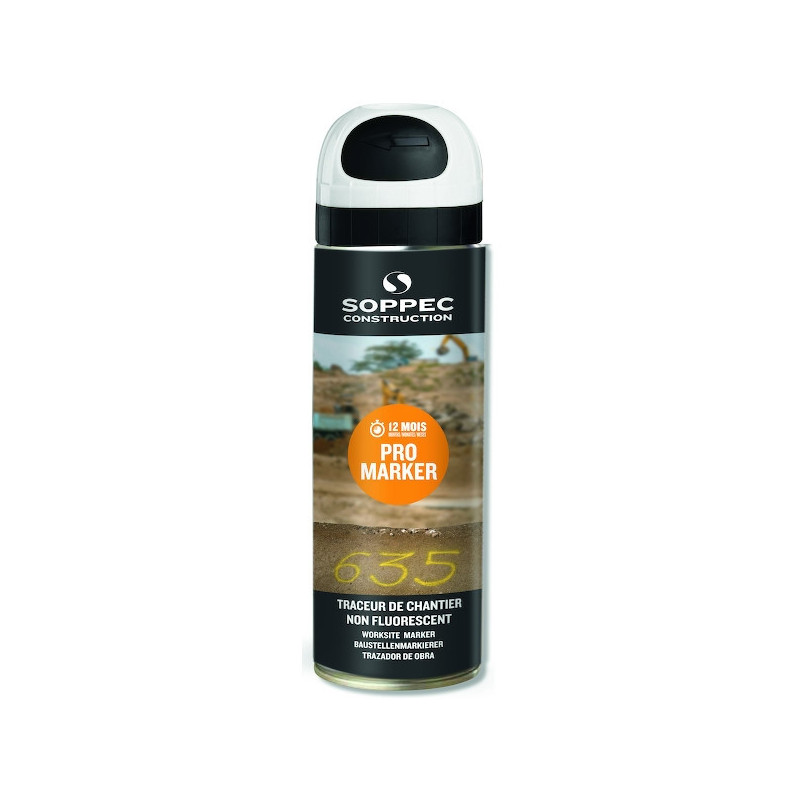 La bombe de peinture chantier non fluorescente PROMARKER s'utilise pour divers travaux de marquage/repérage: voiries. terrassement. canalisations. constructions. installations électriques. Grâce à un excellent pouvoir couvrant cette peinture de marquage non fluorescente permet de masquer efficacement les marquages. La bombe de peinture est dotée du capot de sécurité «TP» breveté Soppec : fiabilité. sécurité. pas de coulures ni de brouillard de peinture. Excellente adhérence sur divers supports (même humides) : bétons. bitumes. sables. bois. herbe… Surface d'application : béton. bitumes. bois. graviers. herbe. minéraux. sables. Sol. Séchage : environ 10 mn. Températures d’utilisation : -20°C à 50°C.