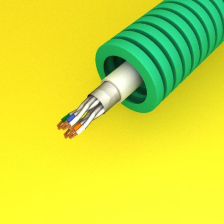 Gaine ICTA verte préfilée avec 1 câble informatique PTT grade 3 haut débit.