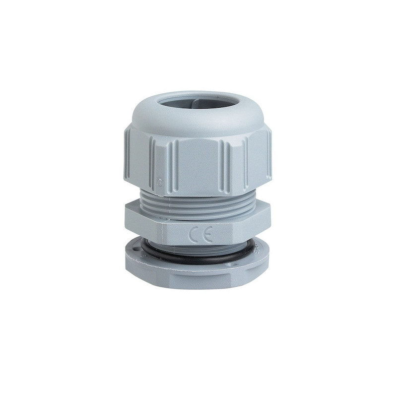 Presse-étoupe plastique RAL 7001 - ISO.Polyamide UL 94-V2 sans halogène.Température d’utilisation : - 20 °C + 80 °C.Autoextinguible : 850°C selon la norme IEC 60695-2-11 pour RAL 7001.