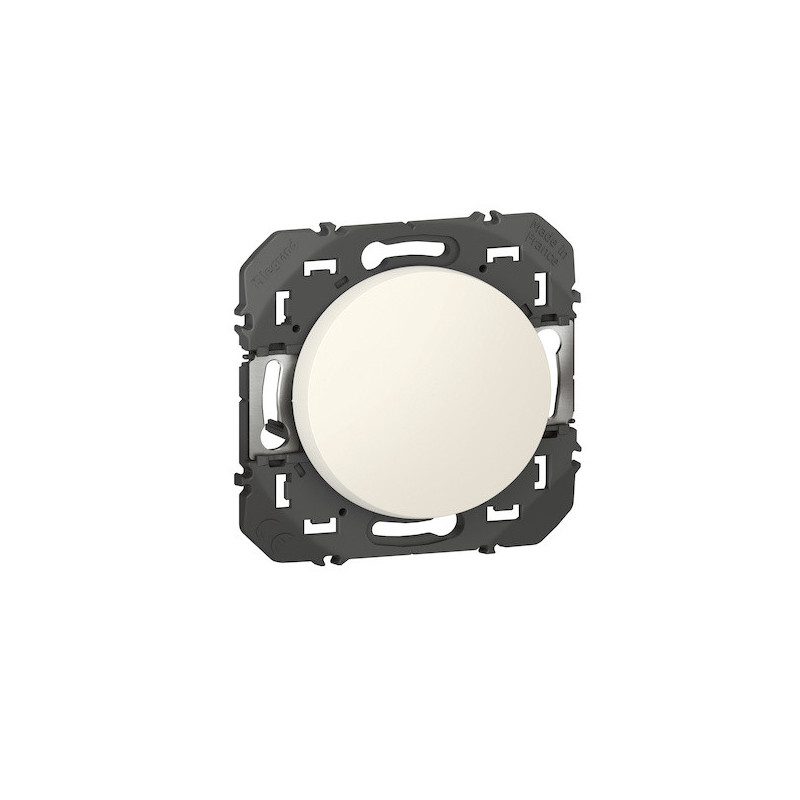 Commande d'éclairage avec support permettant un rattrapage en cas de dérive de pose de la boîte d’encastrement. à équiper d'une plaque.Fixation à griffes et/ou à vis.Livré avec le doigt. le support et la coque de protection chantier.Garantie 2 ans