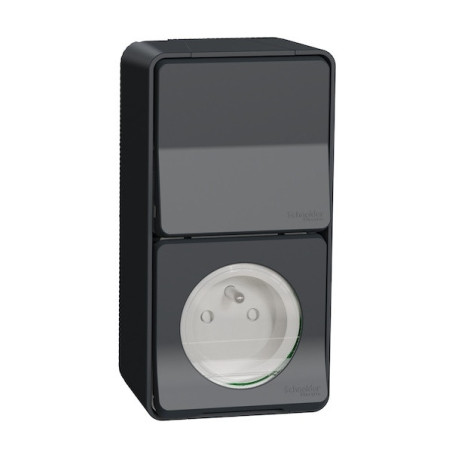 Combiné prise de courant 2P+T 10A / 250V et interrupteur va-et-vient simple 10AX.Permet de commander un éclairage et d'alimenter un appareil électrique.Haute étanchéité. haute résistance aux chocs.Installation verticale en intérieur ou extérieur.Mécanismes de l'interrupteur et de la prise clispables sans outil.Fixation à l'aide de 2 vis filetées métalliques.Livré complet prêt à l'emploi.