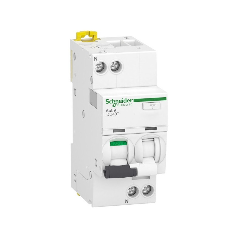 Disjoncteur différentiel Acti9 iDD40T - 6kA. 1P + N. encliquetable.Sensibilité : 30mA.Type AC : pour un usage courant. protège contre les déclenchements intempestifs dus aux surtensions passagères (coup de foudre. manoeuvre d'appareillage sur le réseau...).Les disjoncteurs différentiels iDD40 intègrent une protection magnéto-thermique et une protection différentielle dans un même boîtier.