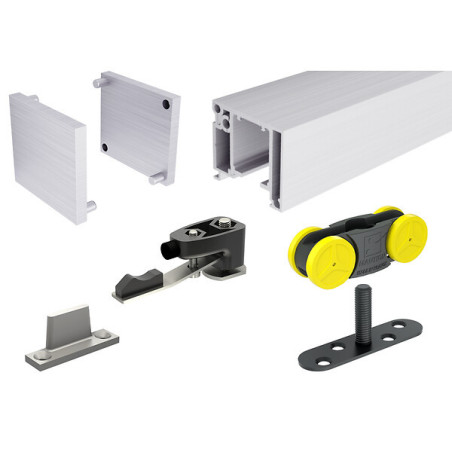 La gamme : Système coulissant aluminium SAF-SLIM pour portes bois jusqu'à 80 Kg. Optimiser vos espaces grâce au systèmes coulissants toujours innovants et de haute qualité. •