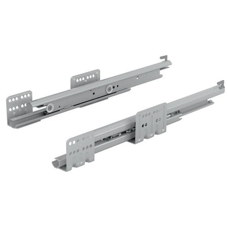La gamme : Coulisses pour profils double paroi ArciTech Hettich.Sortie totale.Coulissement synchronisé.Pour caissons d'épaisseur 19 mm.En acier galvanisé.Capacité de charge selon EN 15338, niveau 3.Amortisseur Silent System intégré. Rappel fin de course sur amortisseur. Compatible Push to Open avec les systèmes d'ouverture P2O Actro Silent System.Pour des façades d'une largeur supérieure à 600 mm, utiliser la barre de synchronisation (9236718)." •