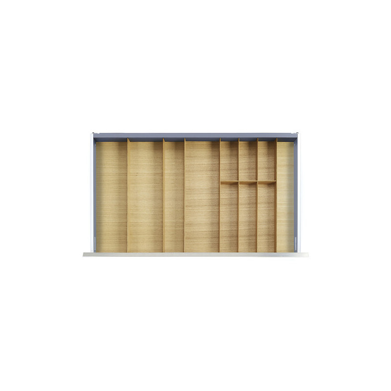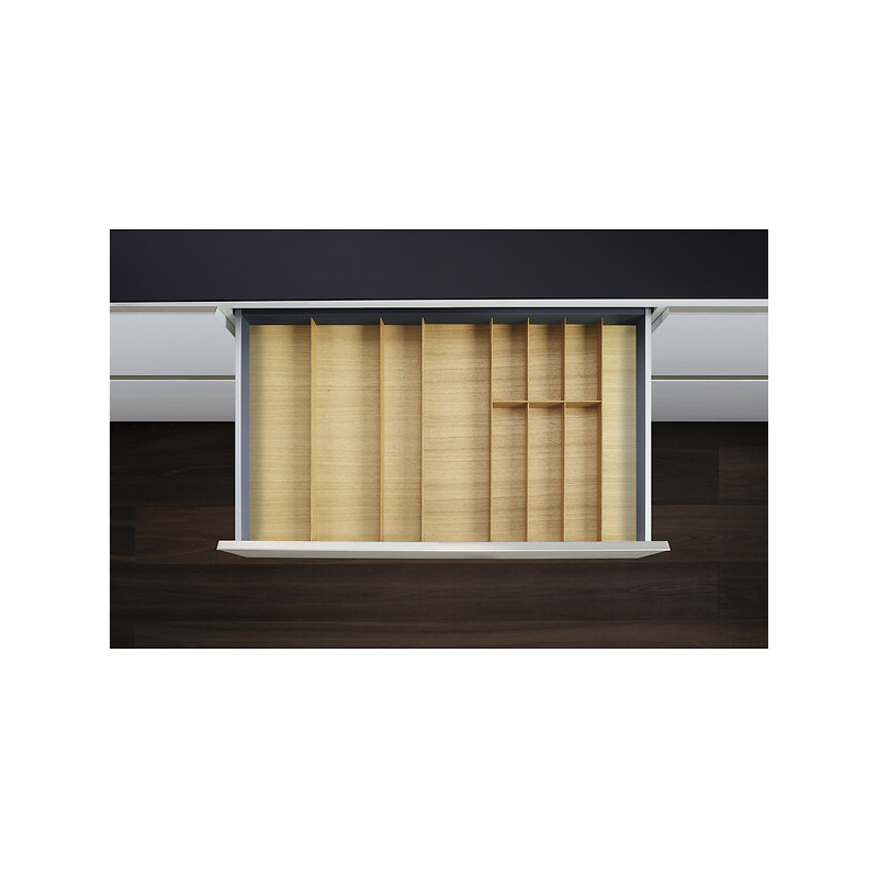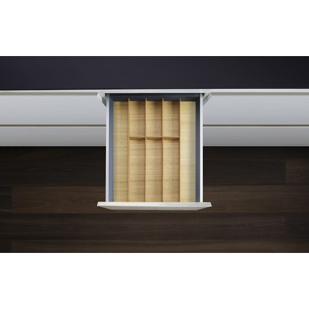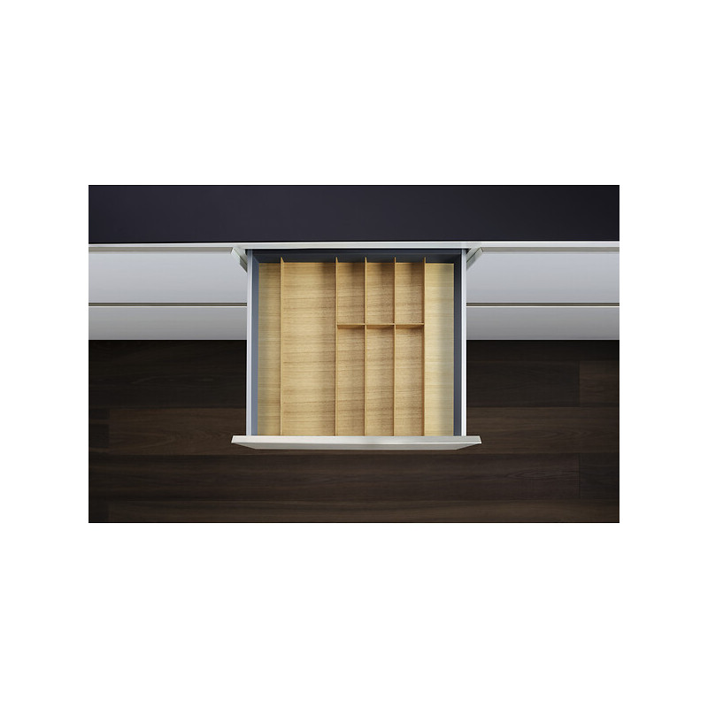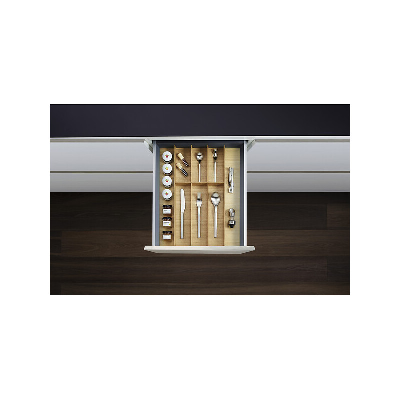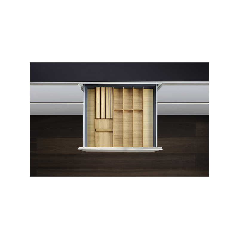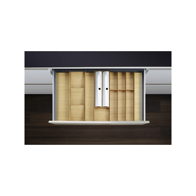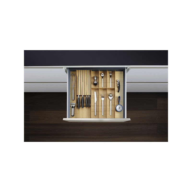 La gamme : FineLine LINIQ propose des sets pré-configurés et accessoires multifonctions pour l'aménagement intérieur des tiroirs. S’adapte parfaitement à toutes les utilisations : cuisine et salle de bain. La gamme est compatible avec tous les tiroirs et systèmes coulissants. Rangement en bois, finition chêne clair. •