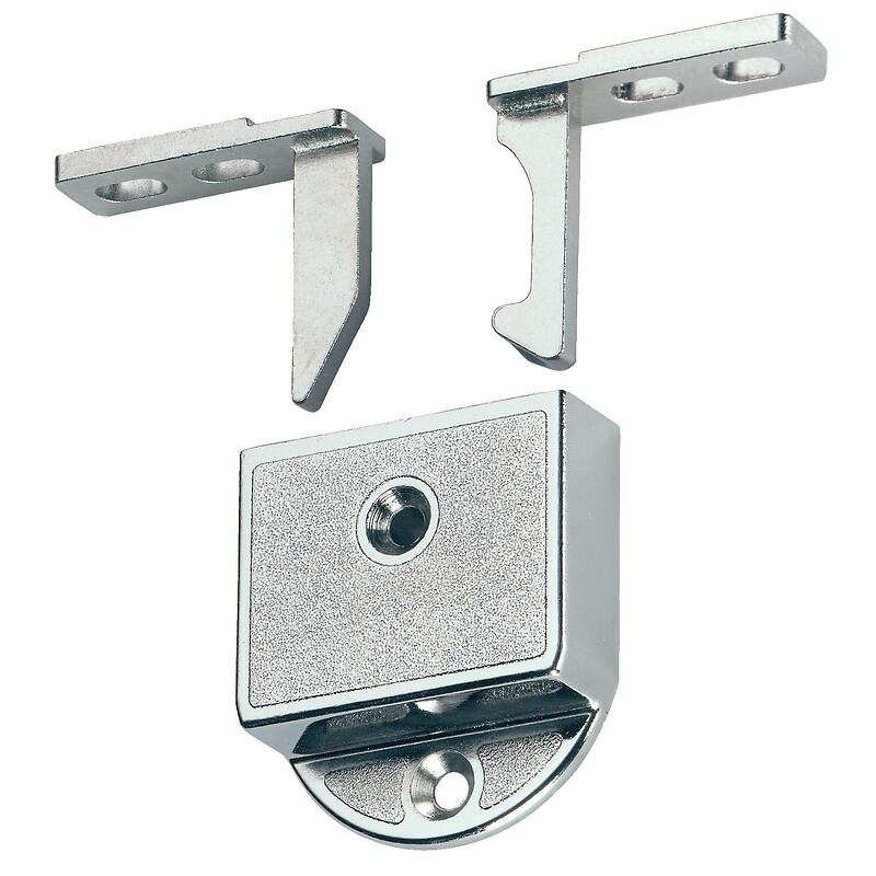 La gamme : Verrou de porte automatique permettant de condamner les portes doubles avec une serrure encastrée sans verrou supplémentaire. Boîtier du verrou automatique vissé sous le panneau supérieur, au centre du meuble, les crochets d'arrêt étant fixés à la partie supérieure des deux portes. Lorsque les crochets s'engagent dans le boîtier automatique, la porte gauche est bloquée et condamnée avec la porte de droite. •