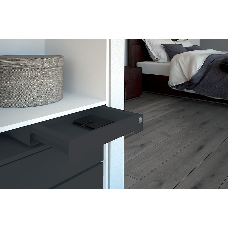 La gamme : "Tiroir compact verrouillable. Pour application sous un bureau ou sous une étagère.Utilisation dans le domaine professionnel (tertiaire, hôtellerie) ou privé (documents, médicaments).Coulisses Quadro Silent System à sortie totale intégrées.Fixation par vissage sous tablette à 37 mm du chant avant (vis Ø6,3 x 14 mm non fournies).Entraxes de fixation : Largeur : 308 mm x Profondeur : 156 mm.En acier recouvert d'une finition poudrée blanche ou anthracite." •