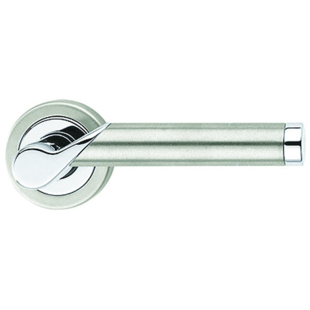 Matière : inox/zamak.Pour porte épaisseur 45 mm.Longueur de la béquille : 130 mm.Ressort de rappel intégré.Saillie de la béquille : 62 mm.Rosace ronde diamètre 52 mm. épaisseur 11 mm avec entraxe de fixation 38 mm.Livrée avec carré 7 mm. sans rosace de fonction.