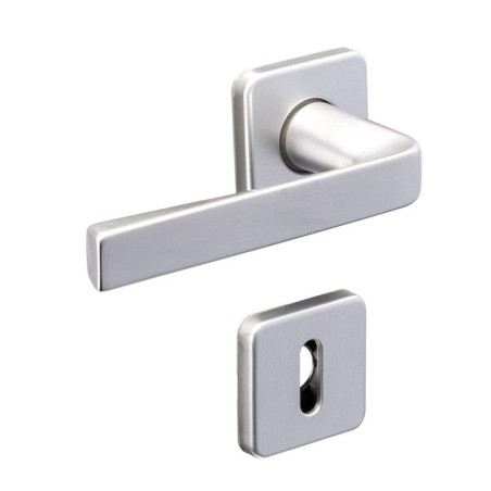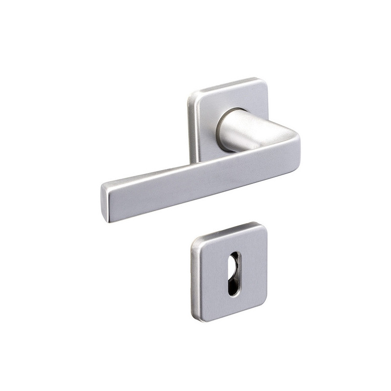 Matière : aluminium.Pour porte épaisseur 40 mm.Longueur de la béquille : 114 mm.Saillie de la béquille : 58 mm.Rosace carrée 46 x 46 mm mm avec entraxe de fixation 38 mm.Livré avec carré 7 mm et rosace de fonction.