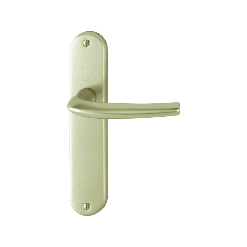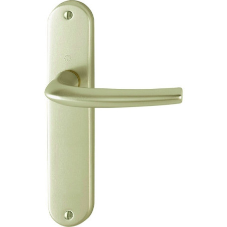 Ensemble monobloc.Matière : aluminium.Entraxe de fixation : 165 mm.Entraxe de serrure : 70 mm.Plaque : 186 x 37 mm.Saillie de la béquille : 47 mm.Livré avec carré 7 mm.