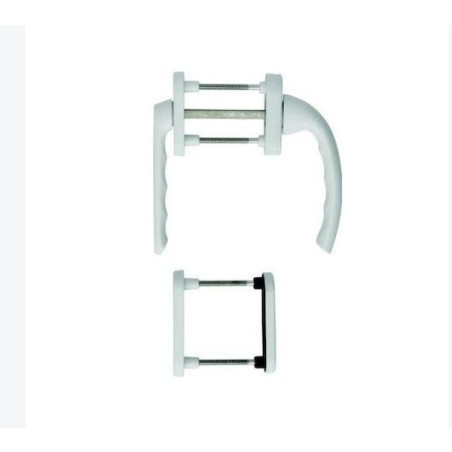 En aluminium sur rosaces avec rosaces à entrée de clé. pour porte-fenêtre à ouverture oscillo-battanteCrantage : extérieur sans. intérieur à 90°Rosaces : extérieur fondue. sous-embase intérieure en polyamide avec capot amovible. piliers de fixationCarré : carré plein HOPPEFixation : non visible. de l'intérieur. traversante. par vis filetées M5Finition: F9016 blanc signalisationPercement: clé I (PZ)Epaisseur de porte: 68-73 mmDimension carré plein: 7 mmDiamètre des piliers: 10 mmCrantage: 90°