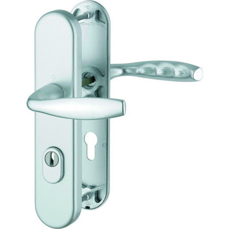 Ensemble de sécurité béquilles doubles sur plaques longues avec protecteur de cylindre. pour porte d'entrée.Equipé du carré à montage rapide.Réversible.Assemblage : poignée libre.Protecteur de cylindre : en acier trempé. pour cylindre dépassant 10-18 mm avec 2 types de pastilles de protection interchangeables.Sous-embase : zamak. piliers de fixationFixation : visible côté intérieur. traversante. vis filetées M6Matière: aluminium.Entraxe de fixation: 195 mm.Entraxe de serrure: 70 mm.Plaque: 250 X 54 mm. épaisseur 15 mm pour la plaque extérieure et 8 mm pour la plaque intérieure.Longueur de la béquille: 133 mm.Saillie de la béquille: 61 mm.Livré avec carré 7 mm.