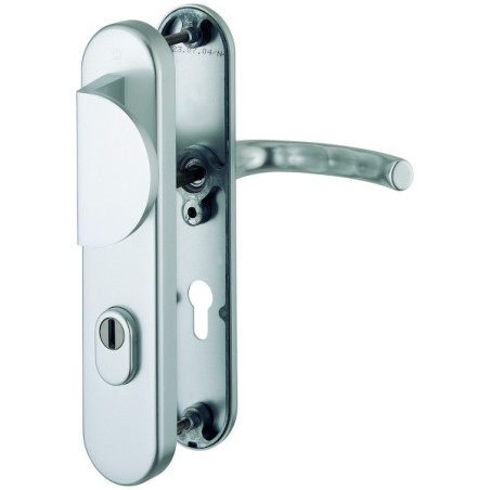Ensemble de sécurité aileron de tirage/poignée sur plaques longues avec protecteur de cylindre. pour porte d'entrée :Equipé ducarré à montage rapide.Réversible.Assemblage : aileron de tirage fixe réversible côté extérieur . poignée libre côté intérieur.Protecteur de cylindre : en acier trempé. pour cylindre dépassant 10-18 mm avec 2 types de pastilles de protection interchangeables.Sous-embase : zamak. piliers de fixationFixation : visible côté intérieur. traversante. vis filetées M6Matière: aluminium.Entraxe de fixation: 195 mm.Entraxe de serrure: 70 mm.Plaque: 250 X 54 mm. épaisseur 15 mm pour la plaque extérieure et 8 mm pour la plaque intérieure.Longueur de la béquille: 133 mm.Saillie de la béquille: 61 mm.Aileron de tiragehauteur 80 mm. largeur 64 mm.Saillie aileron de tirage: 40 mm.Livré avec carré 7mm.
