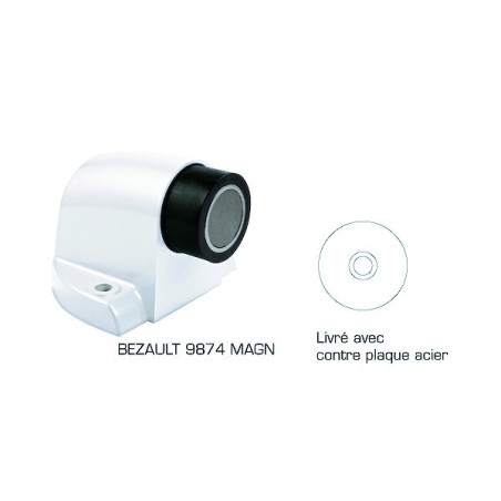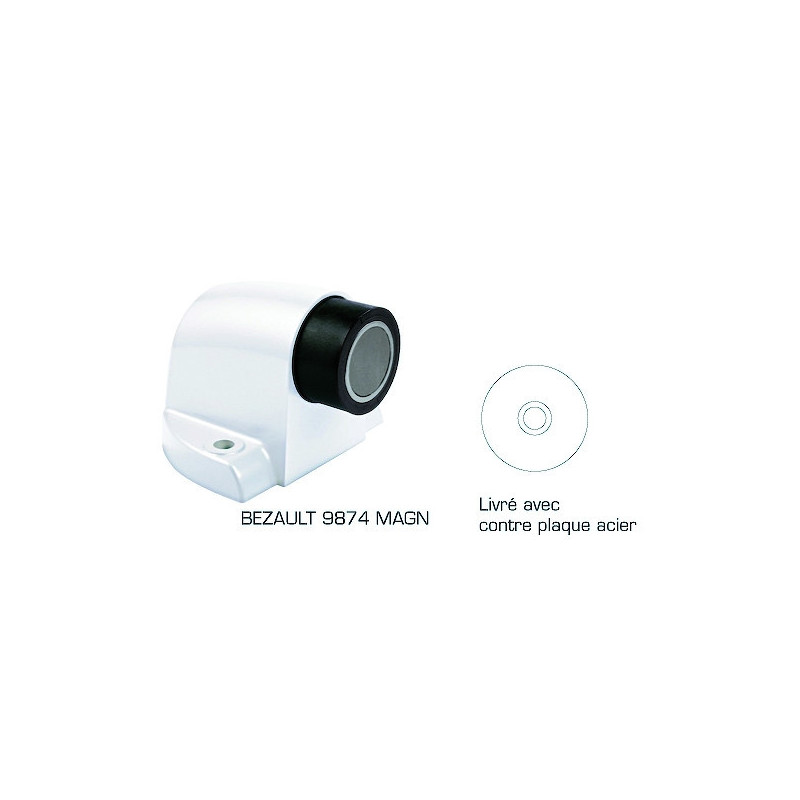 Corps en zamak injecté laqué.Amortisseur en élastomère noir.Force du ressort : 120 kg.Amortissement du choc jusqu'à 8 mm.Force de l'aimant : retenue jusqu'à 35 kg.Dimensions : 96 x 69 mm. hauteur 74 mm.Saillie : 81 mm.Livré sans vis de fixation.