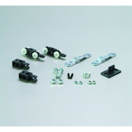 Système de coulissement pour porte rigide.Permet de faire coulisser une porte rigide.Chariots en nylon. avec galets en téflon sur pivot.Frein de blocage réglable en fonction du poids du vantail.La garniture comprend :2 chariots de coulissement.1 glissière inférieure.2 étriers d'ancrage.2 vis de soutien du chariot.2 freins de blocage.Le kit complet comprend :1 garniture.1 rail (longueur suivant le modèle).Équerres à commander séparément.Pose du rail : 1 équerre tous les 40 cm.Garantie 2 ans