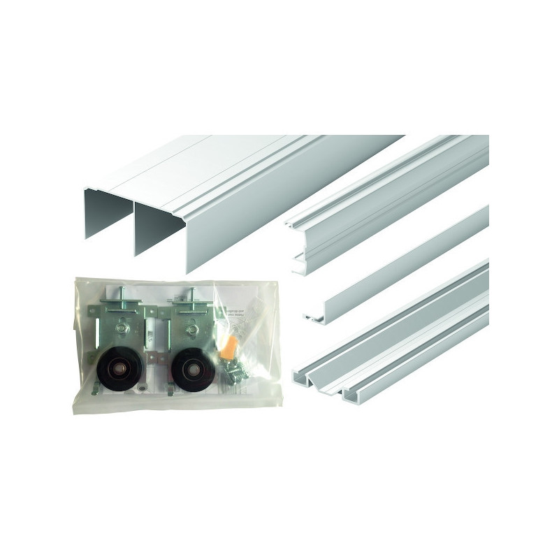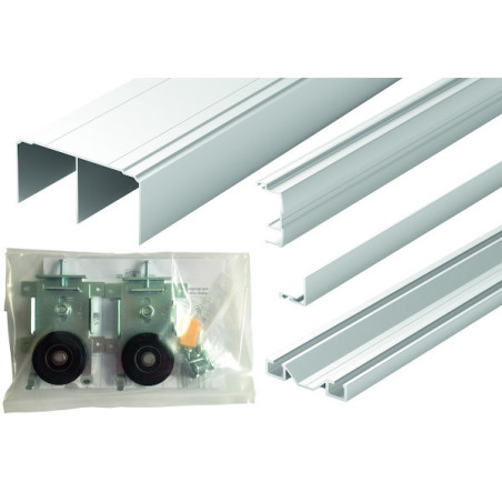 Pour la réalisation de vos portes coulissantes de placards 2 vantaux en panneaux d'épaisseur 19 mm.Matière des profils : aluminium.Ensemble comprenant : • 4 profils de poignées de 2550 mm• 1 rail haut largeur 82 mm et longueur 2500 mm• 1 rail bas largeur 55mm et longueur 2500 mm• 1 cornière basse de 2500 mm• 2 sachets avec 2 guides hauts et 2 roulettes sur roulement à billes à cage étanche et anti-déraillement (système breveté).