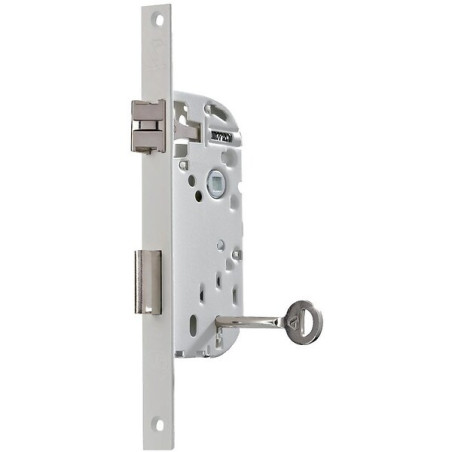 Entraxe mm : 70 - Axe de la serrure : 40 - Fonction de la serrure : Pêne dormant et demi-tour - Forme des bouts de la tétière : Ronds - Avec gâche : Oui - Réversible : Oui - Type de pose : À larder - Conditionnement : 1 - Nombre de points : 1 - Matière du coffre : Acier - Finition de la têtière : Laqué blanc - Largeur de la têtière (mm) : 20 - Unité de vente : (1 pièce) •