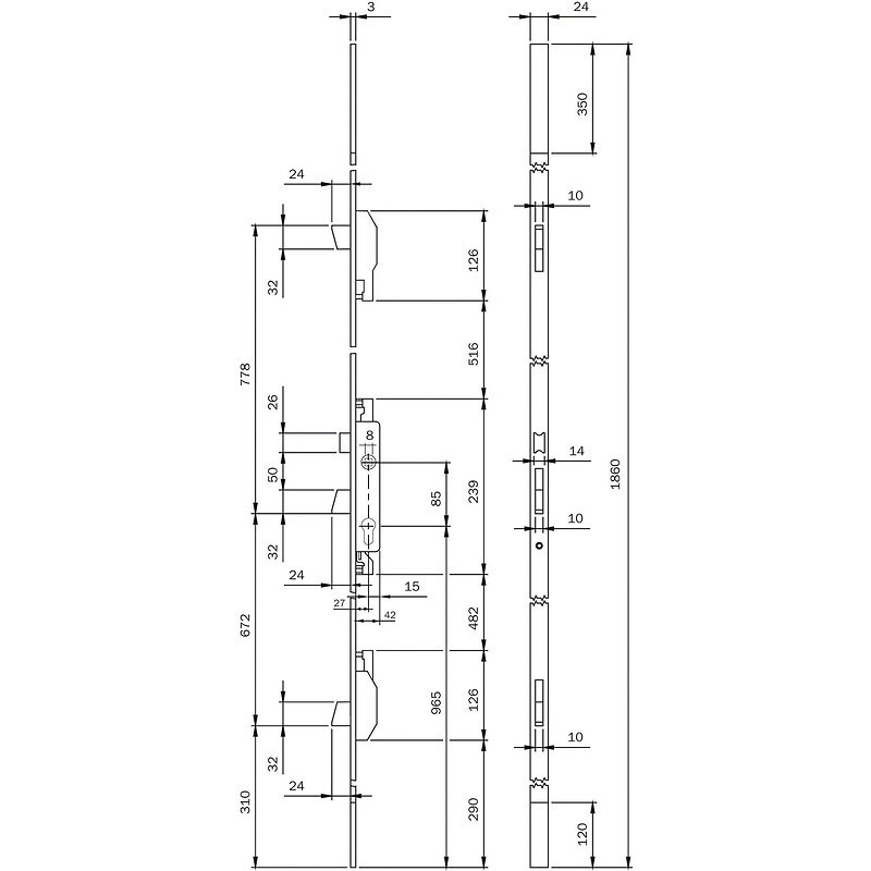 Forme de la têtière : Plate - Fonction de la serrure : À cylindre européen - Réversible : Oui - Type de pose : À larder - Nombre de points : 3 - Entraxe (mm) : 85 - Dimension du carré (mm) : 8 - Hauteur de la têtière (mm) : 1860 - Largeur de la têtière (mm) : 24 - Unité de vente : (1 pièce) •