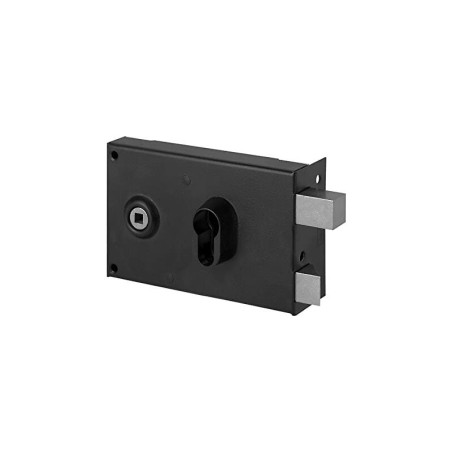 Finition : Noir - Mode d'ouverture de la serrure : À fouillot - Orientation de la serrure en applique : Horizontale - Avec gâche : Oui - Type de pose : En applique - Nombre de points : 1 - Matière du coffre : Acier - Type : Pour cylindre européen - Axe au fouillot (mm) : 110 - Hauteur du coffre (mm) : 88 - Largeur du coffre (mm) : 140 - Dimension du carré (mm) : 6 - Axe à la clé (mm) : 52 - Longueur du cylindre (mm) : 60 - Unité de vente : (1 pièce) •