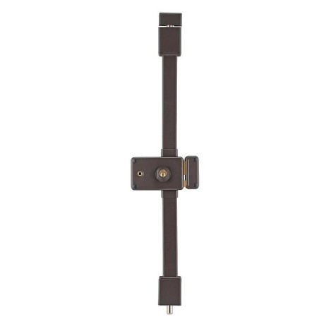 La gamme : Boîtier en acier embouti ép. 20/10ème, tringle standard permettant une condamnation de porte de 1,65 m à 2,25 m.Mécanisme intérieur type équerre permettant la manoeuvre du 1/2 tour avec la clé, de l’intérieur comme de l’extérieur.Pêne dormant et 1/2 tour en laiton massif.Pêne haut et bas en acier ø 16 mm sur tringles télescopiques en acier permettant un ajustement très précis à la longueur désirée et ne nécessitant aucune recoupe.Cache tringle, guides et gâches de pênes haut et bas en acier ne laissant apparaître aucune vis de fixation.Finition : peinture époxy.Livrée avec 4 clés. •