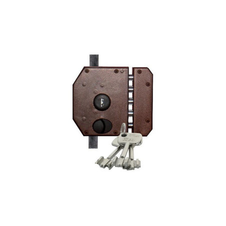 Finition : Marron - Mode d'ouverture de la serrure : À tirage - Orientation de la serrure en applique multipoint : Verticale - Axe de la clé (mm) : 61 - Axe du cylindre (mm) : 61 - Type de pose : En applique - Nombre de points : 3 - Avec clés : Oui - Nombre de clés : 3 - Unité de vente : (1 pièce) •