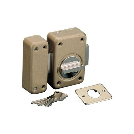 Finition : Bronze - Matière : Acier - Nombre de clé : 3 - Type de verrou : À bouton et cylindre - Longueur du pêne du verrou : 110 - Diamètre du cylindre du verrou (mm) : 23 - Longueur du cylindre du verrou : 45 - Avec gâche : Oui - Unité de vente : (1 pièce) •