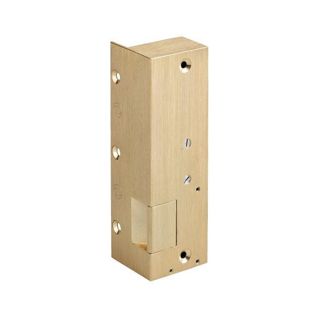 La gamme : Ensemble en bronze composé d'une gâche électrique et d'une serrure. Pour utilisation extérieure.Simple empennage. Saillie réduite. Modèle gâche : à impulsion.Tension : 12 V ca/cc. Consommation ca/cc : 0,7/1,5 A.Plus d'informations pour choisir votre produit : Les gâches électriques sont alimentées en 12 ou 24 V alternatif ou continu.(Utilisation d'un transformateur ou d'une alimentation.)Gâche à émission (ou à impulsion) : La porte se déverrouille à l'impulsion électrique (on parle ici de protection des biens).Gâche à contact stationnaire : La porte se déverrouille à l'impulsion électrique et reste déverrouillée jusqu'à une action physique d'ouverture/fermeture de la porte (le plot mécanique doit de nouveau être enfoncé par le pêne de la serrure).Application : gâche de confort, portes équipées d'un ferme-porte.Gâche à rupture : La porte se déverrouille lorsque la gâche n'est plus alimentée (on parle ici de protection des personnes). •
