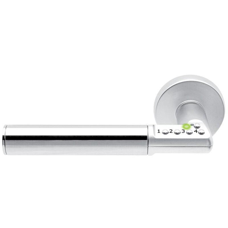 La gamme : Pose sur portes intérieures (conformément à IP40) à fréquentations faibles à moyennes (utilisation inférieure à 80 passages avec code par jour, produit non adapté à un usage intensif) : réserves de commerces, locaux techniques/entretien, scolaire (salle des professeurs, bureaux administratifs).Éviter tout contact avec des produits détergents.Fonctionnement simple : code d’ouverture de 4 à 6 chiffres avec jusqu'à 9 codes utilisateurs différents par poignée.Voyant condamnation/décondamnation.Mise en place aisée : se pose comme une poignée standard et fonctionne avec les serrures standards du marché.Label coupe-feu préservé : pas de câblage ni d’usinage.Sortie toujours libre.Dimensions béquille : 140 x Ø 21 mm.Carré de 7 mm.Pour porte d’épaisseur 35 à 80 mm.Autonomie 100 000 manœuvres.Matière : Inox et zamak finition chromé velours.Livrées avec 2 piles lithium CR2. •
