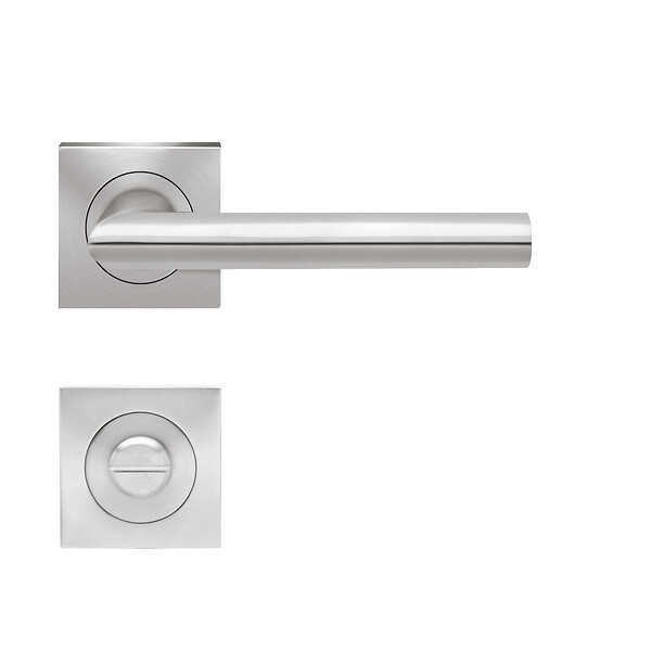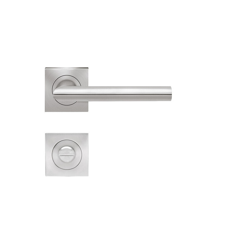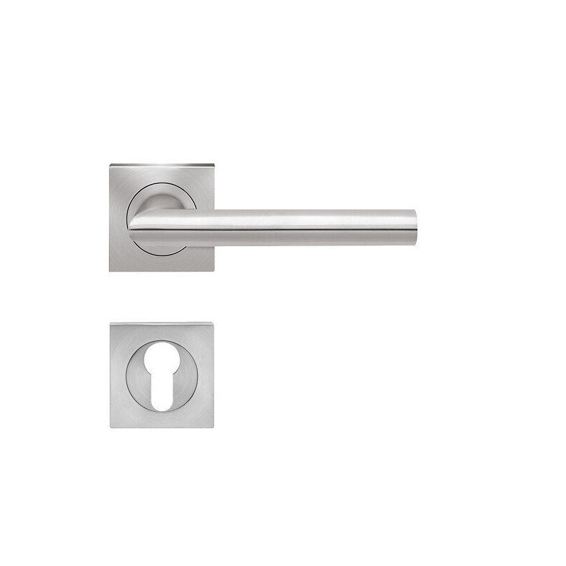 La gamme : Béquilles doubles sur rosace.Carré de 7 et fourreau serrure carré de 8 mm.Épaisseur de porte maximum : 45 mm.Norme du produit : Conforme à la norme DIN 1906 cat. 3.Livré avec visserie et carré. •