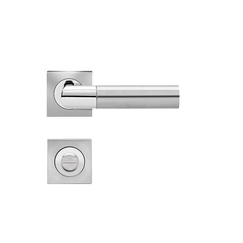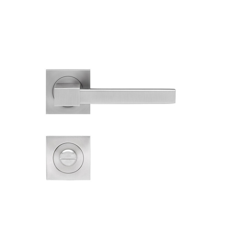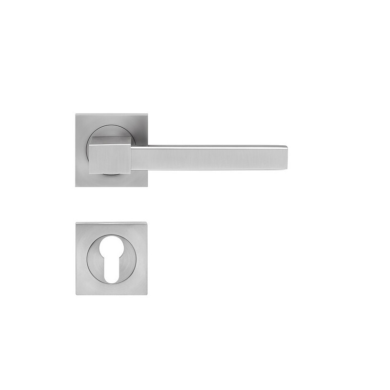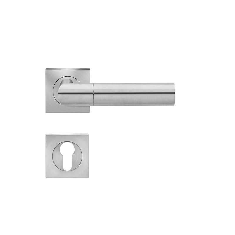 La gamme : Béquilles doubles sur rosace.Carré de 7 et fourreau serrure carré de 8 mm.Épaisseur de porte maximum : 45 mm.Norme du produit : Conforme à la norme DIN 1906 cat. 3.Livré avec visserie et carré. •