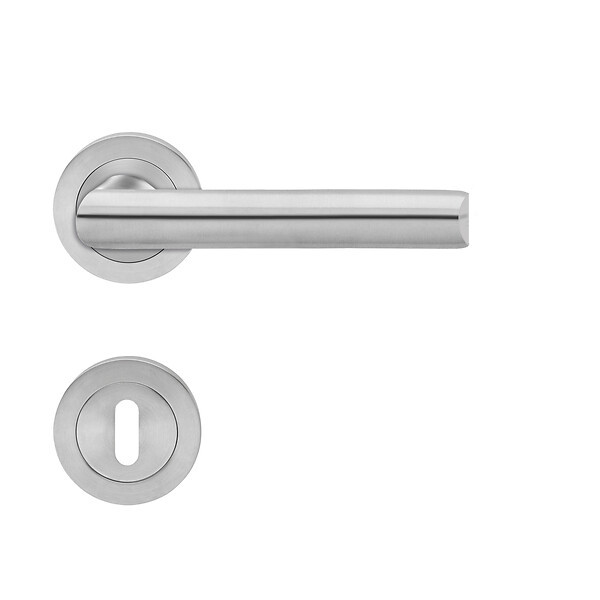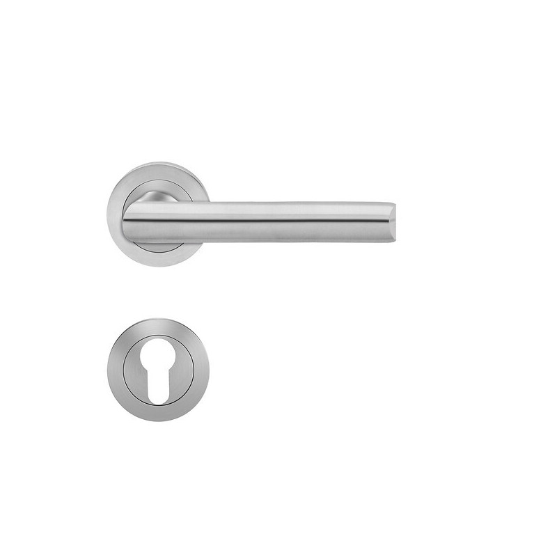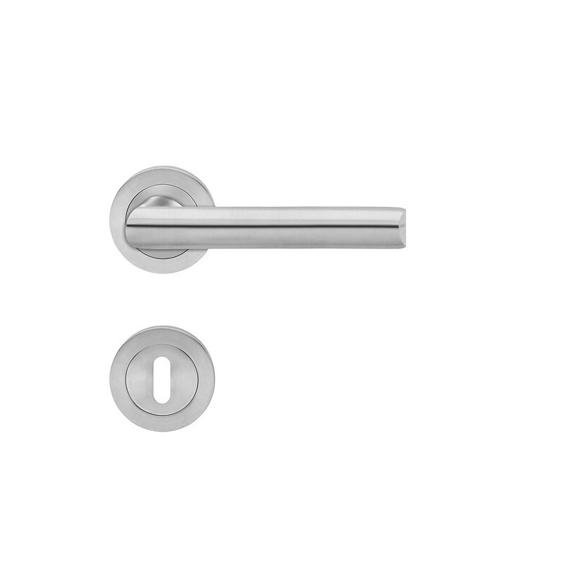 La gamme : Béquilles doubles sur rosace.Carré de 7 et fourreau serrure carré de 8 mm.Épaisseur de porte maximum : 45 mm.Norme du produit : Conforme à la norme DIN 1906 cat. 3.Livré avec visserie et carré. •