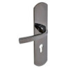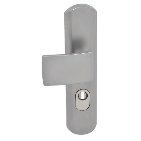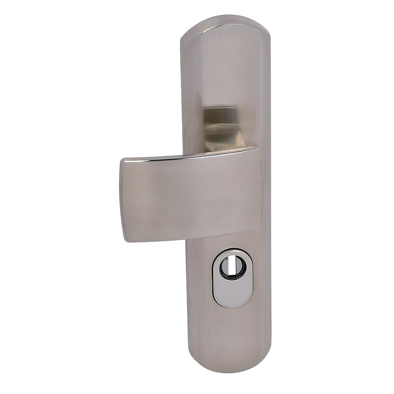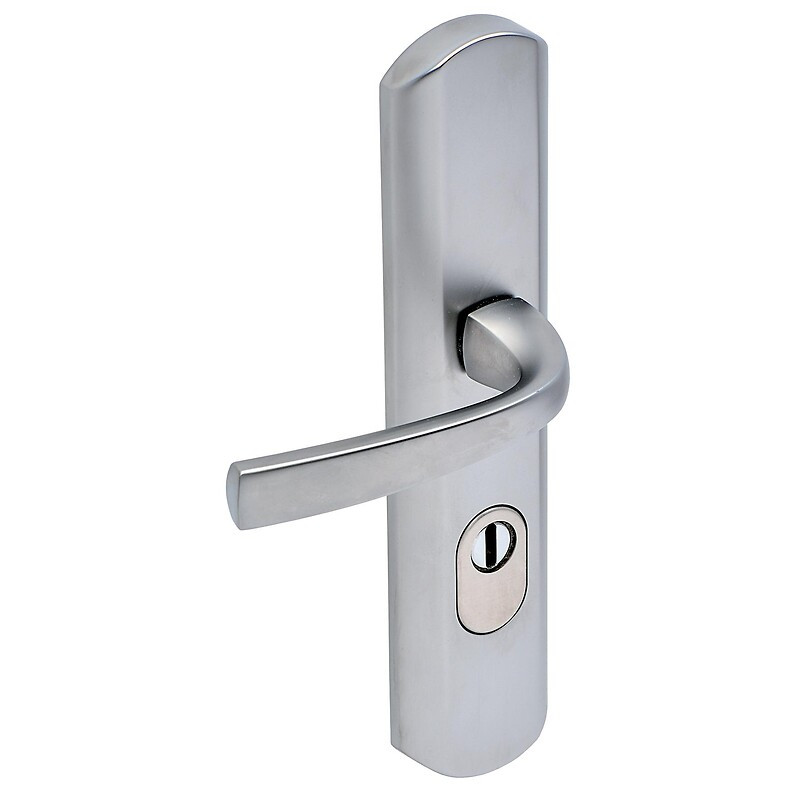 La gamme : Ensembles de sécurité équipés de béquilles doubles ou béquille et poignée de tirage (palière).Pour serrure axe à 50 mm minimum et entraxe à 70 mm.Entraxe de fixation standard 195 mm.Pour porte d’épaisseur de porte de 40 mm.Carré de 7 mm.Fixation invisible.Plaques renforcées avec 2 piliers anti-percement et protecteur de cylindre auto-adaptable breveté pour l’extérieur de la porte.Dimensions plaques : 245 x 56 mm (Ép.15 mm côté extérieur et 7 mm côté intérieur). •