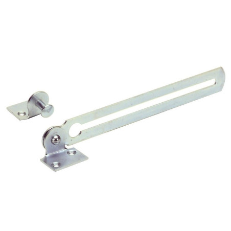 La gamme : Pose à plat.En acier zingué.Longueur : 200 mm.Plus d'informations pour choisir votre produit : Les bonnes questions...Il est posé sur châssis :- bois, alu, PVC. S'il est posé sur alu ou PVC, demander la marque du profil.Il dépend de plusieurs cotes :- hauteur du châssis, et/ou des châssis, si superposés,- largeur du châssis, et/ou des châssis, si côte à côte,- hauteur au sol (bas ou haut du châssis),- poids du châssis.Si on ne connaît pas le poids du châssis, demander la nature et l'épaisseur du remplissage.Il dépend du fonctionnement du châssis :- ouvrant pivotant, à soufflet, tombant extérieur, à la française, projetant, relevant intérieur, à l'italienne, basculant.Voir schéma ci-dessous.Il fonctionne par :- tringle rigide,- câble souple.Il est posé :- en ébrasement (profondeur tablette).Il évite :- solive, poteau, linteau ou autre (demander un croquis).Réfléchissez également à sa couleur....L'équipement d'un châssis avec un système de ferme-imposte doit être accompagné par la pose de compas de sécurité en feuillure.Au-delà d'une largeur de vantail de 1200 mm, prévoir un système à deux points de verrouillage afin d'obtenir une étanchéité optimale du châssis. •