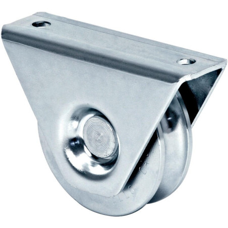 Finition : Zingué - Matière : Acier - Charge (kg) : 200 - Largeur (mm) : 36 - Diamètre (mm) : 80 - Profondeur de la gorge (mm) : 8 - Largeur d'entrée de gorge (mm) : 25 - Pour rail : Intercity ou Rapido Ø 15,5 - Forme de la gorge : 1/2 ronde - Dimensions du support (millimètre (mm)) : 117 x 71 - Unité de vente : (1 pièce) •