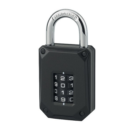Finition : Noir - Type : Intérieur - Matière de l'anse : Acier cémenté nickelé - Matière du coffre : Alliage moulé - Type de fermeture : Combinaison modifiable - Nombre de molettes : 4 - Hauteur du coffre (mm) : 62 - Largeur du coffre (mm) : 45 - Diamètre de l'anse (mm) : 7 - Épaisseur du coffre (mm) : 20 - Hauteur du U de l'anse (mm) : 23 - Largeur du U de l'anse (mm) : 22 - Unité de vente : (1 pièce) •
