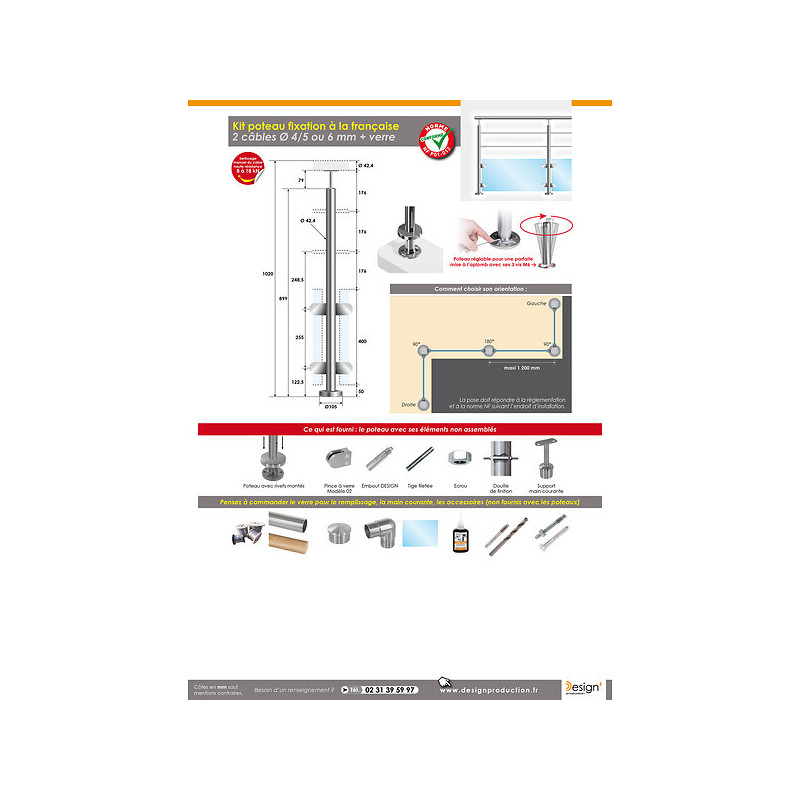 Poteaux pré-équipés à la française - support main-courante Ø 42.4 mm + 2 support câble Ø 6 mm + pinces à verre - DESIGN PRODUCTION