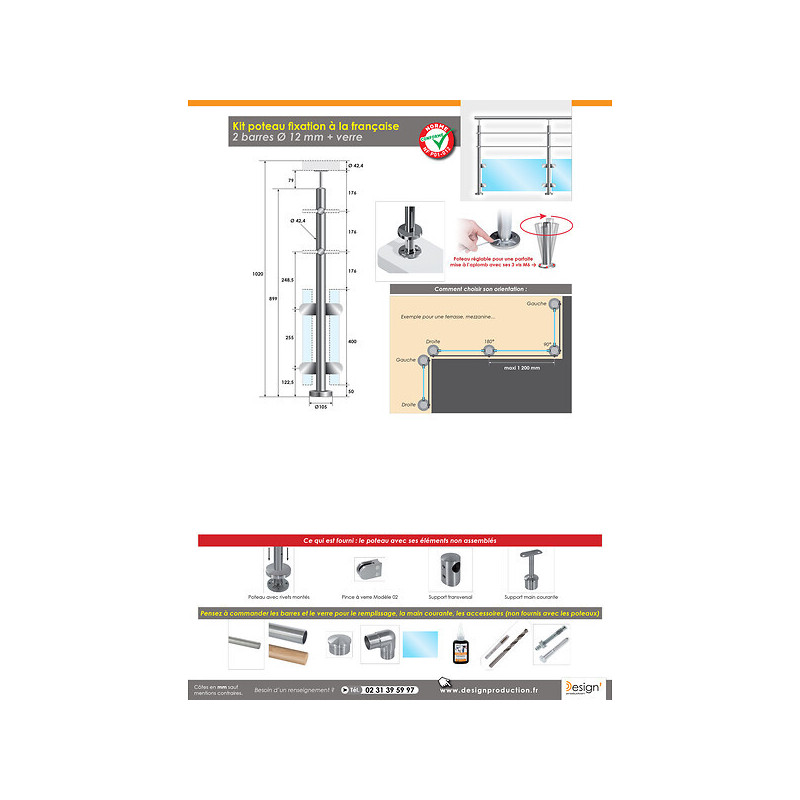 Poteaux pré-équipés à la française - support main-courante Ø42.4 et 2 barres Ø12 + pinces à verre - DESIGN PRODUCTION