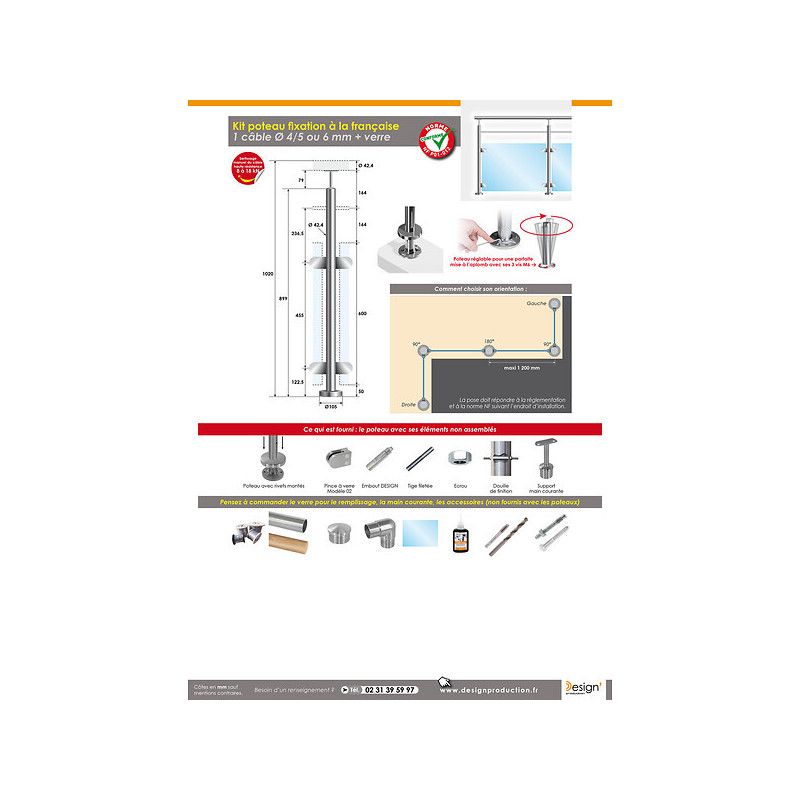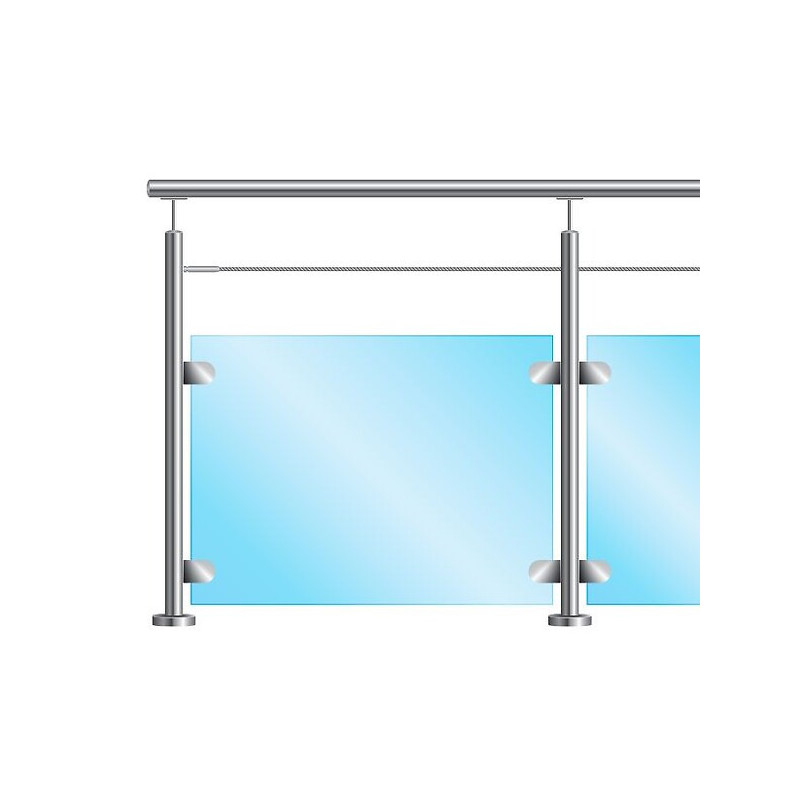 Poteau pré-équipé à la française - support main-courante Ø 42.4 mm et 1 support câble Ø 6 mm avec pinces à verre - DESIGN PRODUCTION