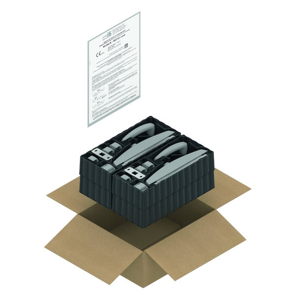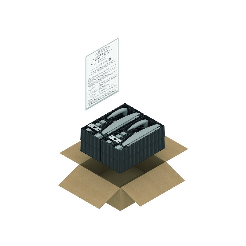 Pack de 4 boîtiers et gâches de crémone pompier à poignée rotative. Les tringles sont à commander séparément.Livrée avec guides et gâches