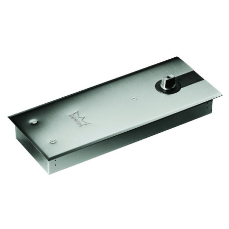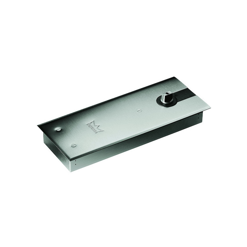 Pivot à frein hydraulique. réversible. pour porte double action. d'un poids de vantail maximum de 100 kg. Force fixe 3 EN (porte de 950 mm de largeur maxi.). Conception peu profonde (40 mm) pour un encombrement minimum dans le sol. 1° Vitesse de fermeture de 130° à 20°. réglable par valve hydraulique. 2° Vitesse de fermeture de 130° à 0°. réglable par valve hydraulique. Attention : variantes avec maintien en position ouvert. interdites sur porte coupe-feu et pare-flammes.Plaque de recouvrement et ferrures haute et basse. axe amovible. carré ou rectangulaire à commander séparément.