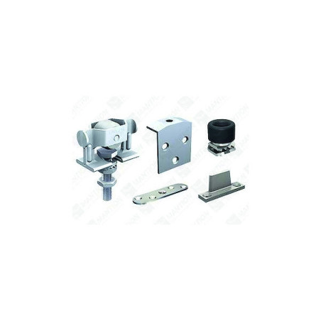 Kit pour une porte de 40 kg maxi. à déplacement droit. Garniture comprenant : 2 montures 222 avec 2 platines 26 et 21. 2 butées d’extrémité 1097. 1 guide 1103. 1 clé plate de 13. vis de pose et notice de montage. Rail 2525 F à commander séparément.