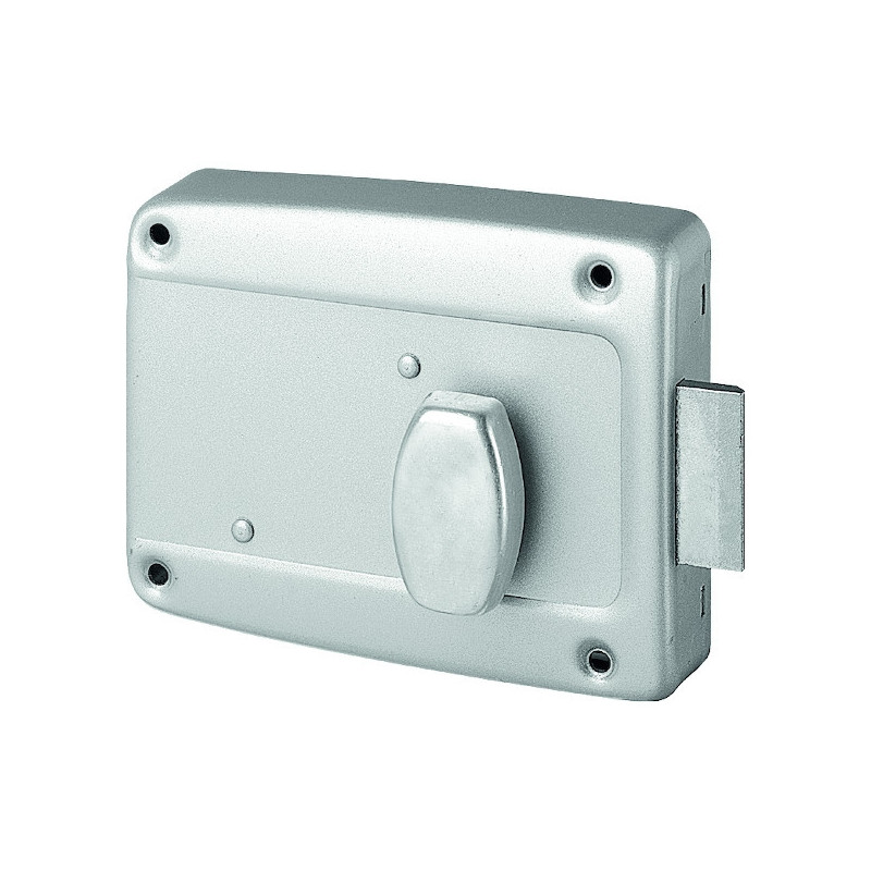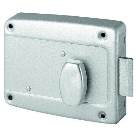 La serrure 6903 est à cylindre et possède un bouton intérieur. La porte de garage s'ouvre ainsi par pression sur le cylindre poussoir.Livrée avec une gâche et une poignée en PVC.
