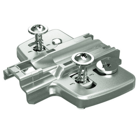 Embase 8099 pour charnières Sensys et Intermat Vis cruciformes prémontées pour les panneaux de particules. Réglage en hauteur par excentrique à + ou -2 mm.