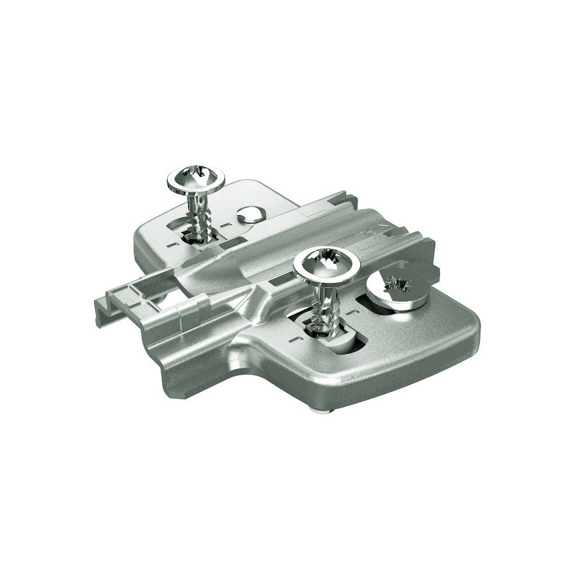 Embase 8099 pour charnières Sensys et Intermat Possible à partir d’une épaisseur de montant de 15 mm. Distance de perçage : 32 mm. Avec vis spéciales prémontées et manchons en plastique pour perçages Ø 5 x 12 mm. Réglage en hauteur par excentrique +/- 2 mm. Acier nickelé.