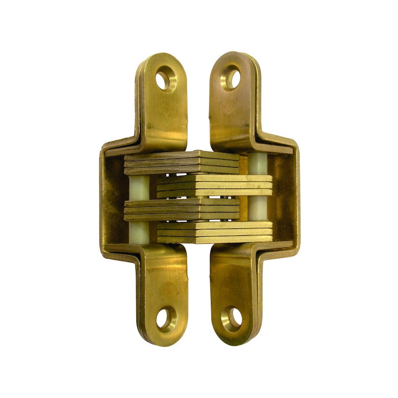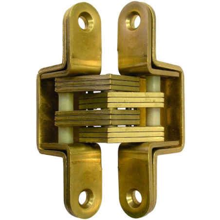 Cette charnière invisible possède un axe en inox. Elle permet une ouverture à 180°. Charnière et mécanisme laiton.