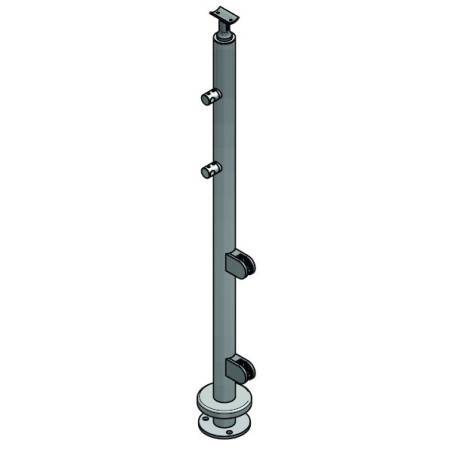 Poteau départ à gauche. Platine 100 mm sans cache. avec support de main courante. Finition : Inox 304 brossé. 2 pinces à verre 777424. 2 supports de lisse Ø12.2 mm.